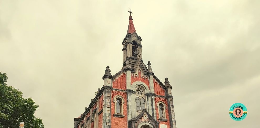 Esta capilla está construida en ladrillo visto y piedra caliza e incluye elementos neorrománicos y neogóticos propios del estilo historicista, además de «vidrieras realizadas a partir de bocetos del pintor José Uría».