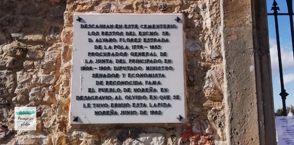 Justo en frente, al otro lado de la carretera, se encuentra el cementerio. En él descansan los restos del Excmo. Sr. D. Álvaro Florez Estrada, de la Pola (1776-1853), procurador general de la Junta del Principado en 1808-1809, Diputado, Ministro, Senador y Economista de reconocida fama en el pueblo de Noreña.