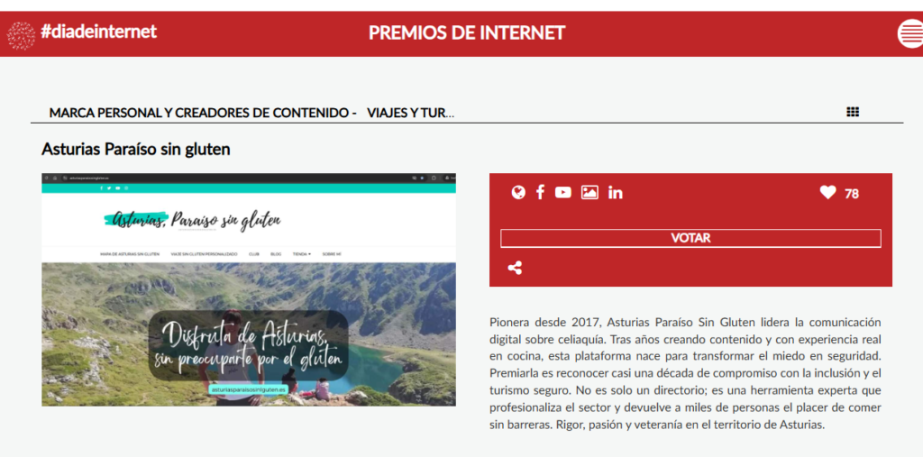 En el caso de Asturias, Paraíso sin gluten, compite en la categoría de Marca Personal y Creadores, en la subcategoría de Viajes y Turismo. Ya que, aunque el blog está orientado a que las personas celiacas que viajan por Asturias, puedan hacerlo sin preocuparse por el gluten, gracias a todos los establecimientos que hay preocupándose por atender correctamente a nuestro colectivo, sin los cuales esta web no sería posible.