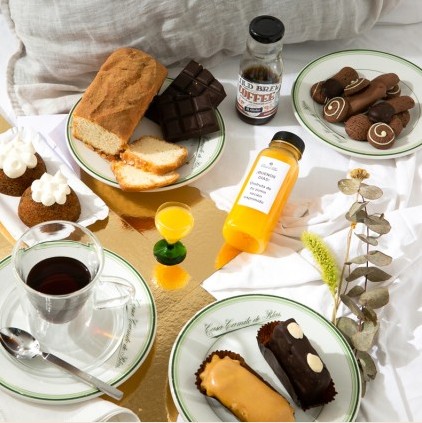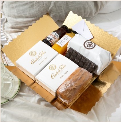 También tienes la posibilidad de comprar el Desayuno sin gluten, que incluye: 1 bizcocho genovés sin gluten, 1 tableta de chocolate negro, blanco o con leche, 2 bizcochitos de zanahoria sin gluten cubiertos de crema de queso, 1 caja de 250g de pastas de chocolate sin gluten, 1 Joel y un carbayón sin gluten, 2 bebidas a escoger: café Cold Brew, batido de chocolate Pascual o zumo de naranja natural. Caja convertible en mantel: incluye una servilleta con lazo y un sobre con mensaje(*)