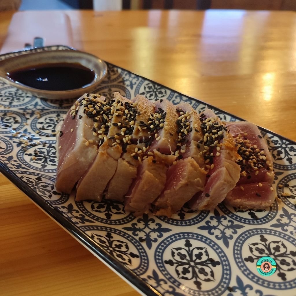 Disfrutamos de las croquetas con cecina y membrillo y un tataki de atún con salsa de soja. Lo acompañamos de Mahou 5 estrellas sin gluten. ¡Todo ello espectacular!